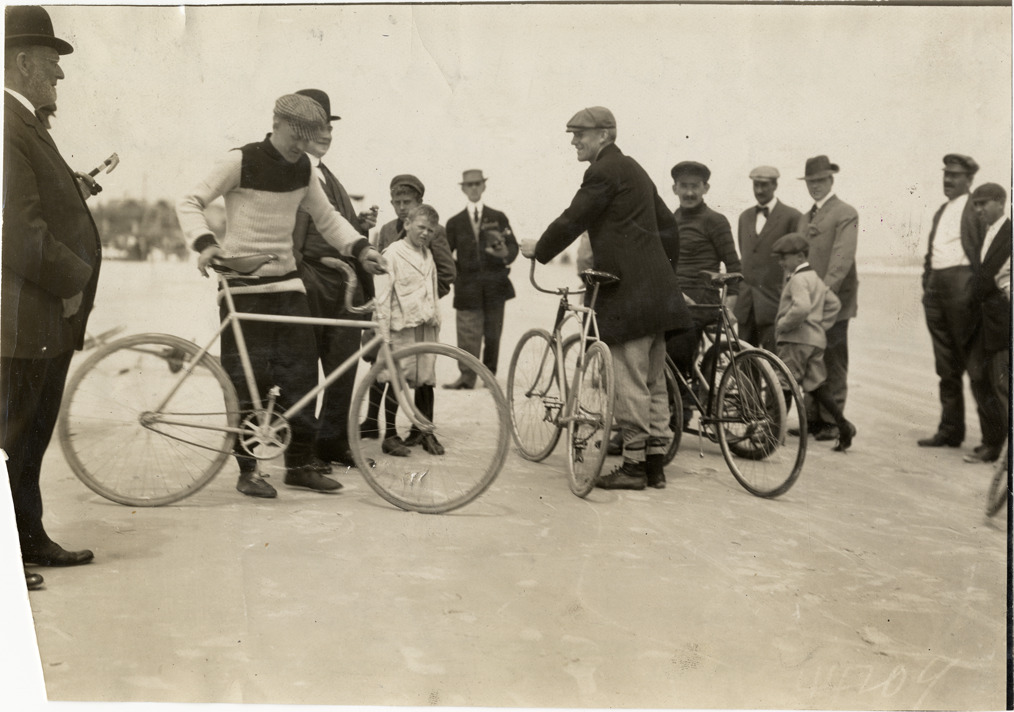 View of bicyclists Joseph Folger and E.F. Root with bicycles before race during the 1908 Ormond-Daytona races in Florida. Stamped on back: "Spooner & Wells, Inc., photographers, telephones 3472-3473 Columbus, 1931 Broadway, New York." Handwritten on back: "Root & Folger, 6 day team & referee Kelsey introducing bycycle [sic] races at Ormond meet, March 1909 [sic]. Races and racing--Ormond-Daytona, 1908."