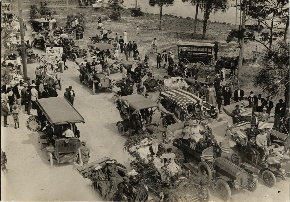 Bird's-eye view of cars in parade during the 1908 Ormond-Daytona races in Florida. Cars are decorated with American flags and floral decorations; Daytona Citizen's Band in bus; horse-drawn vehicle in background. Stamped on back: "Spooner & Wells, Inc., photographers, telephones 3472-3473 Columbus, 1931 Broadway, New York." Handwritten on back: "Races and racing--Ormond-Daytona, 1908."
