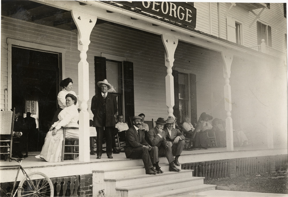 View of men and women sitting on porch of wooden-frame building, possibly a hotel, during the 1908 Ormond-Daytona races in Florida. Sign over entrance reads [in part]: "George." Stamped on back: "Spooner & Wells, Inc., photographers, telephones 3472-3473 Columbus, 1931 Broadway, New York." Handwritten on back: "Races and racing--Ormond-Daytona, 1908."