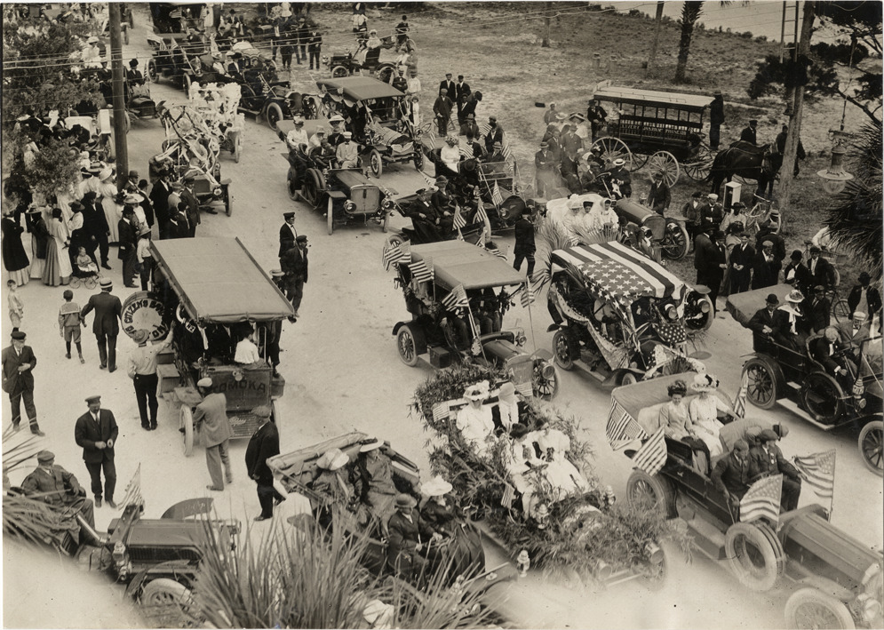 Bird's-eye view of cars in parade during the 1908 Ormond-Daytona races in Florida. Cars are decorated with American flags and floral decorations; Daytona Citizen's Band in bus; horse-drawn vehicle in background. Stamped on back: "Spooner & Wells, Inc., photographers, telephones 3472-3473 Columbus, 1931 Broadway, New York." Handwritten on back: "Races and racing--Ormond-Daytona, 1908."