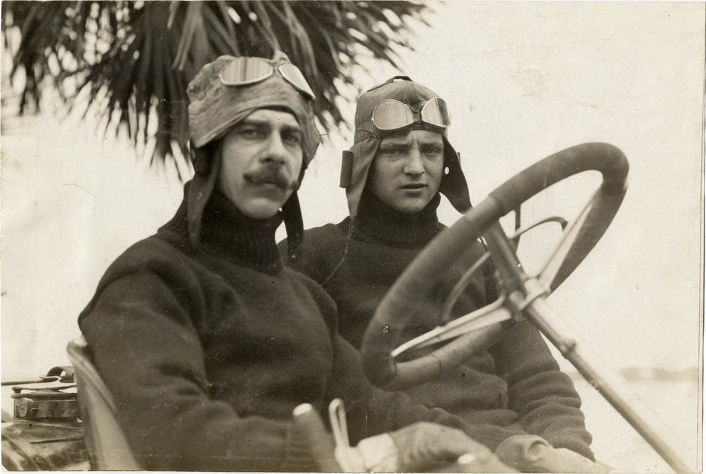H.J. Kilpatrick and passenger in Hotchkiss racecar, 1908 Ormond-Daytona races