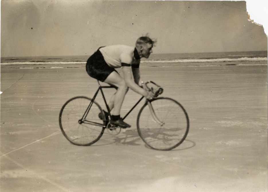 View of man racing bicycle during the 1908 Ormond-Daytona races in Florida. Stamped on back: "Spooner & Wells, Inc., photographers, telephones 3472-3473 Columbus, 1931 Broadway, New York." Handwritten on back: "Races and racing--Ormond-Daytona, 1908."