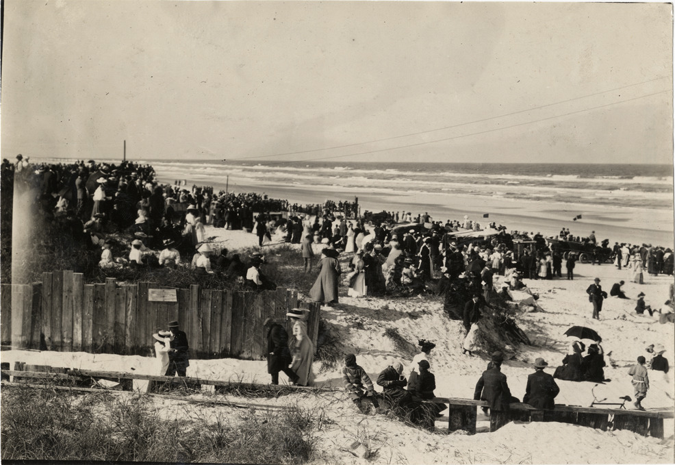 View of spectators, some with cars, on beach during the 1908 Ormond-Daytona races in Florida. Stamped on back: "Spooner & Wells, Inc., photographers, telephones 3472-3473 Columbus, 1931 Broadway, New York." Handwritten on back: "Races and racing--Ormond-Daytona, 1908."
