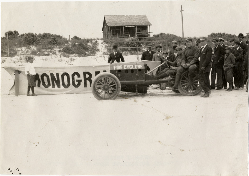 George Robertson and group of men posing with Fiat Cyclone racecar, 1908 Ormond-Daytona races