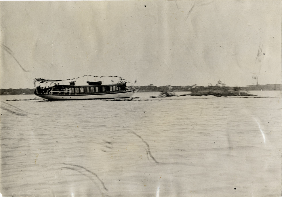 Distant view of passengers on the houseboat "Sweetheart" during the 1908 Ormond-Daytona races in Florida. Boat is decorated with flags. Stamped on back: "Spooner & Wells, Inc., photographers, telephones 3472-3473 Columbus, 1931 Broadway, New York." Handwritten on back: "Sweetheart. Races and racing--Ormond-Daytona, 1908."