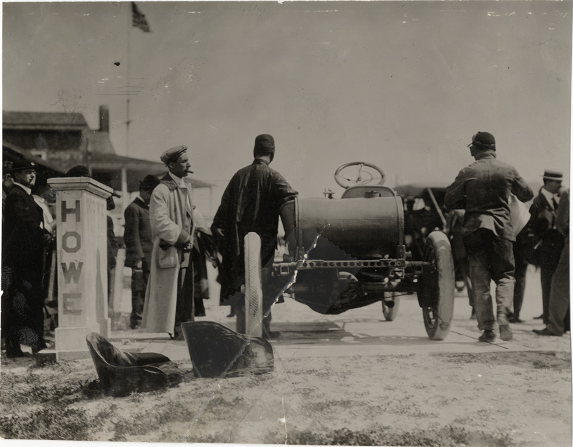 Harry Levey and crew with Hotchkiss racecar, 1908 Ormond-Daytona races
