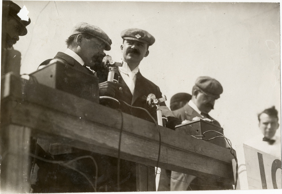 View of Robert Lee Morrell, E.R. Hollander and Samuel M. Butler in timers' stand during the 1908 Ormond-Daytona races in Florida. Handwritten on back: "Robert Lee Morrell, E.R. Hollander, S.M. Butler always [undecipherable]. Races and racing--Ormond-Daytona, 1908."