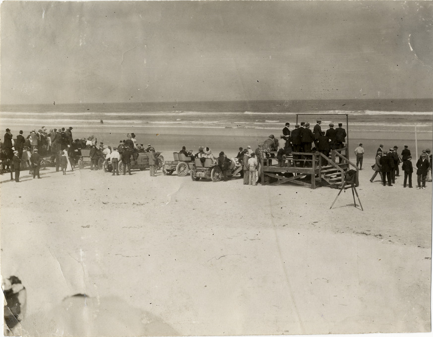 View of spectators, some with cars, on beach during the 1908 Ormond-Daytona races in Florida. Stamped on back: "Spooner & Wells, Inc., photographers, telephones 3472-3473 Columbus, 1931 Broadway, New York." Handwritten on back: "View from grandstand. Races and racing--Ormond-Daytona, 1908."