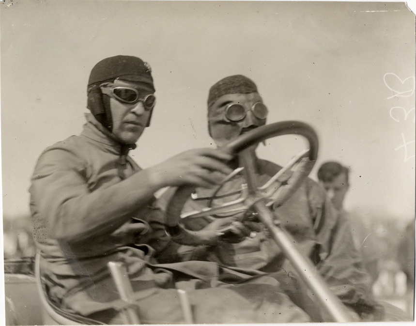 Driver and passenger in racecar, 1908 Ormond-Daytona races