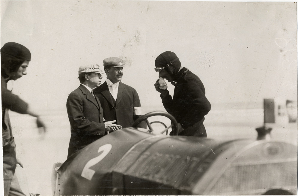 Officials speaking with Emanuel Cedrino, 1908 Ormond-Daytona races