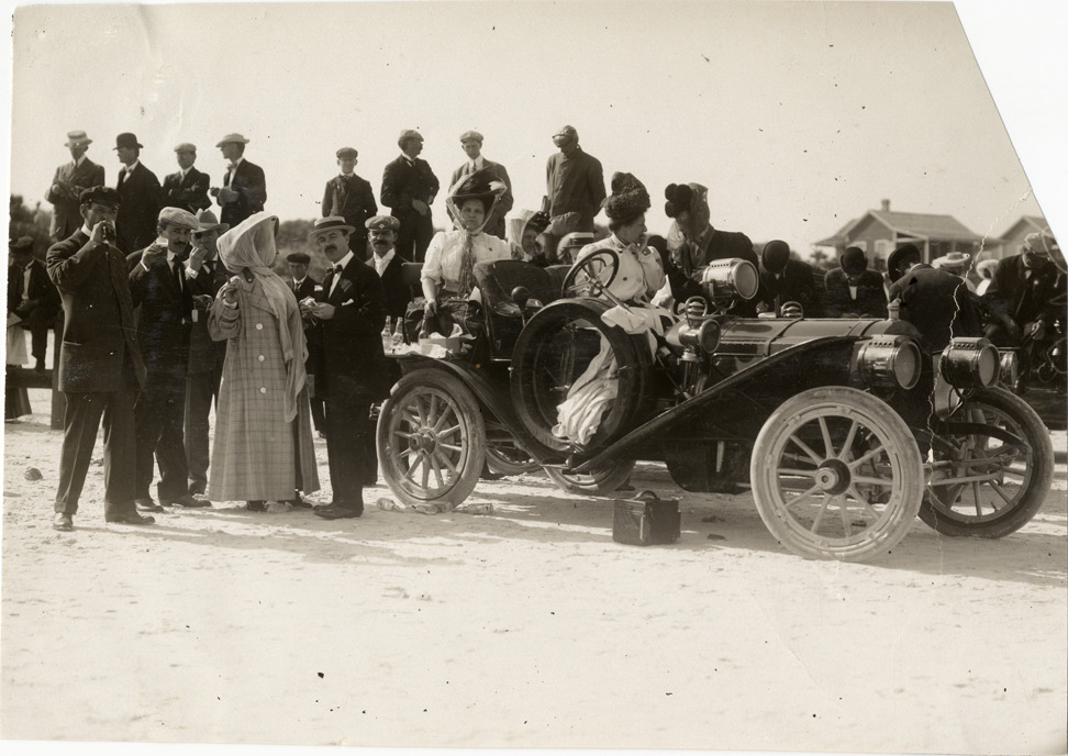 View of spectators, some sitting in car, having lunch on beach during the 1908 Ormond-Daytona races in Florida. Handwritten on back: "Lunch arrives for guests at Hotel Ormond. Races and racing--Ormond-Daytona, 1908."