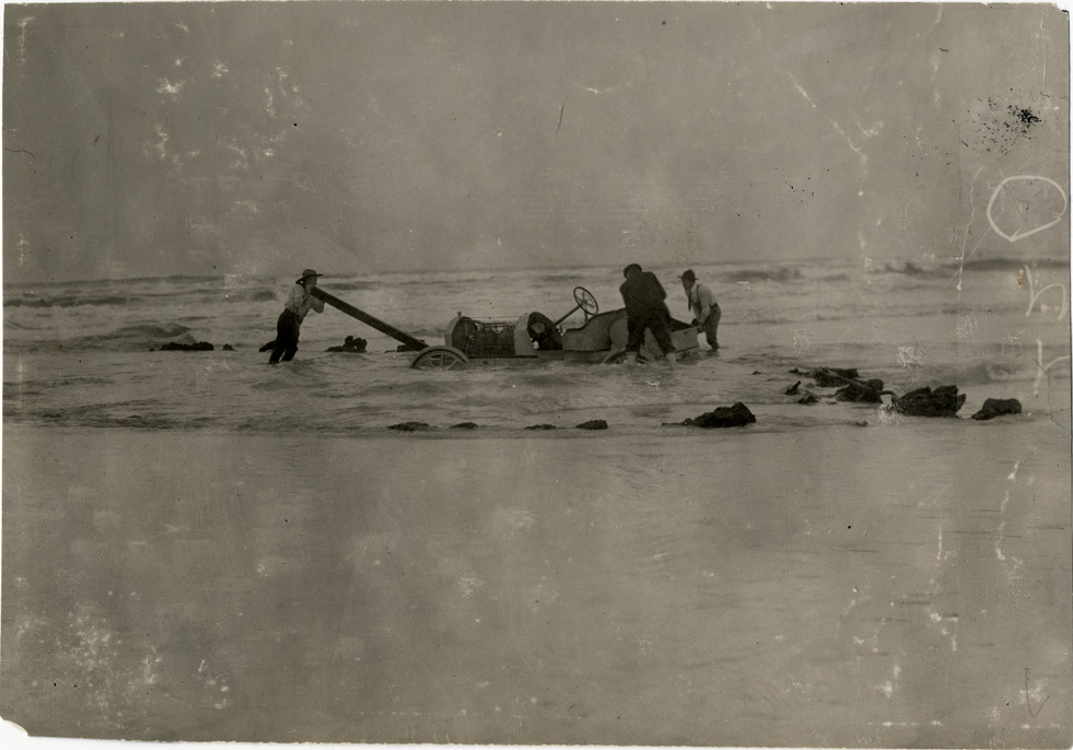 Cleveland Runabout automobile after collision with shipwreck, 1908 Ormond-Daytona races