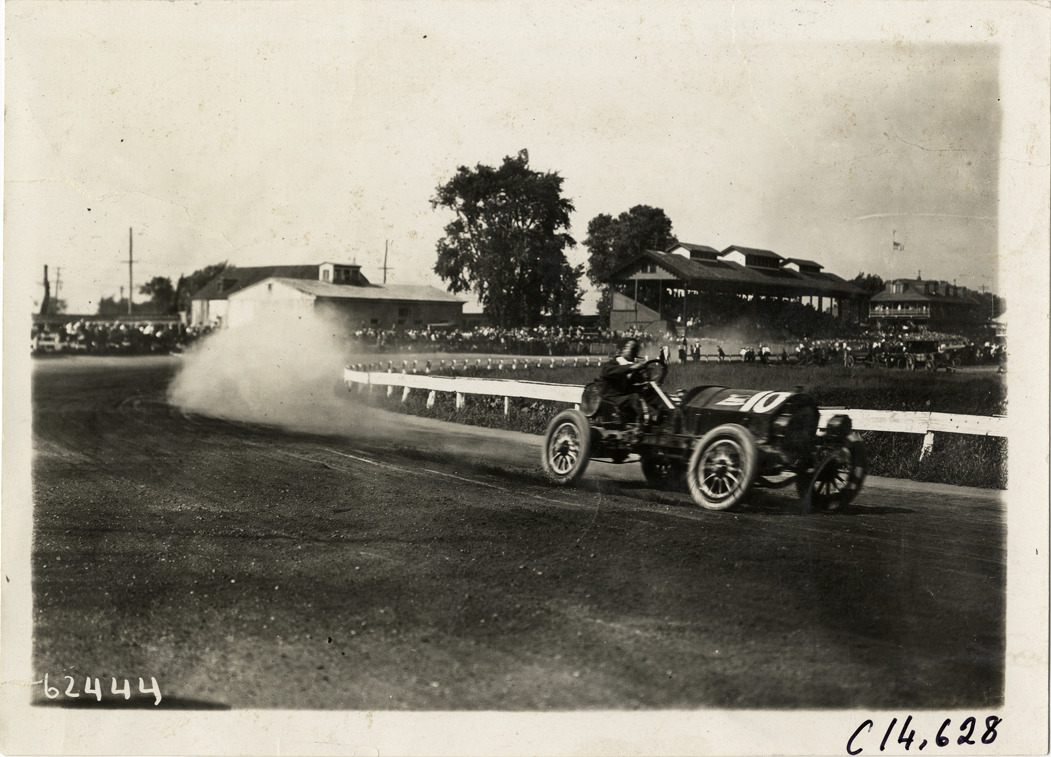 View of driver racing car during the 1910 races at the Point Breeze racetrack in Philadelphia, Pennsylvania. Grandstand and spectators in background. Stamped on back: "Spooner & Wells, Inc., photographers, telephones 3472-3473 Columbus, 1931 Broadway, New York." Handwritten on back: "Races and racing--Point Breeze races, 1910."