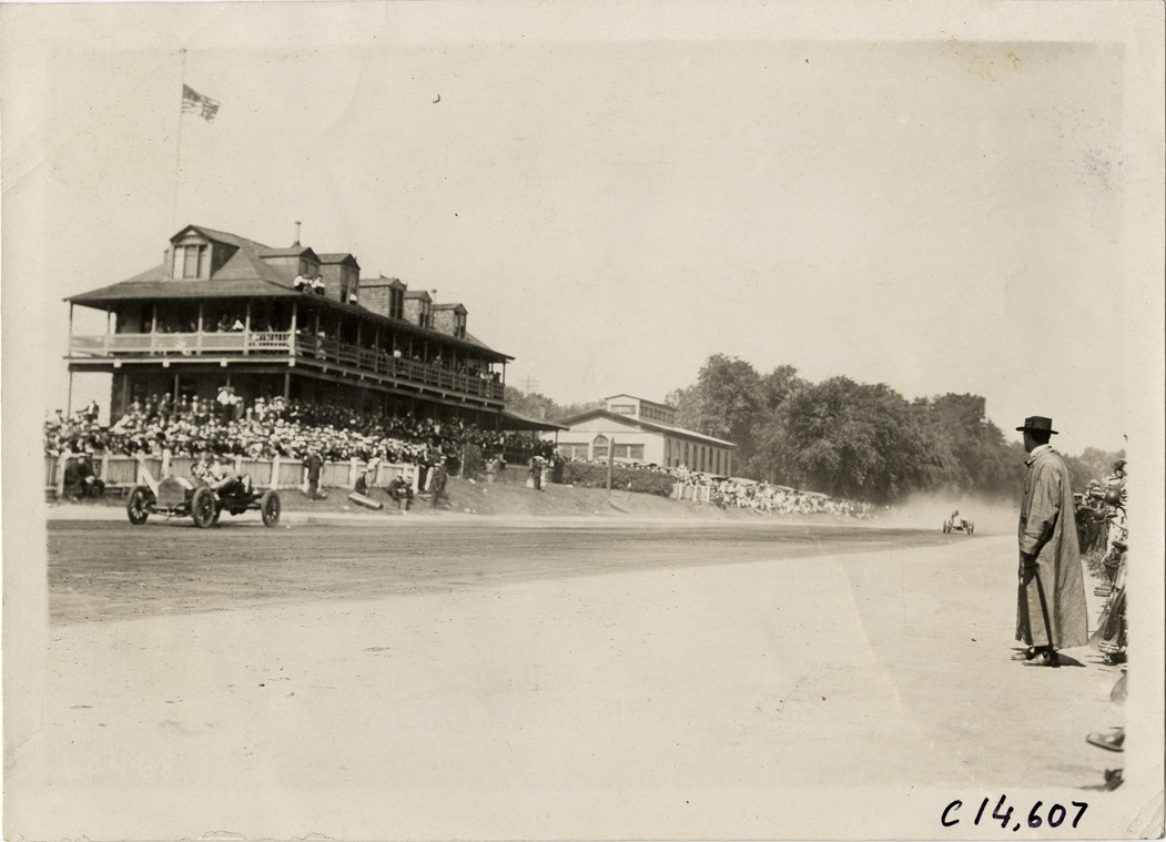 View of George Jones racing Otto car past clubhouse during the 1910 races at the Point Breeze racetrack in Philadelphia, Pennsylvania. Stamped on back: "Spooner & Wells, Inc., photographers, telephones 3472-3473 Columbus, 1931 Broadway, New York." Handwritten on back: "Jones in Otto car. Races and racing--Point Breeze races, 1910."