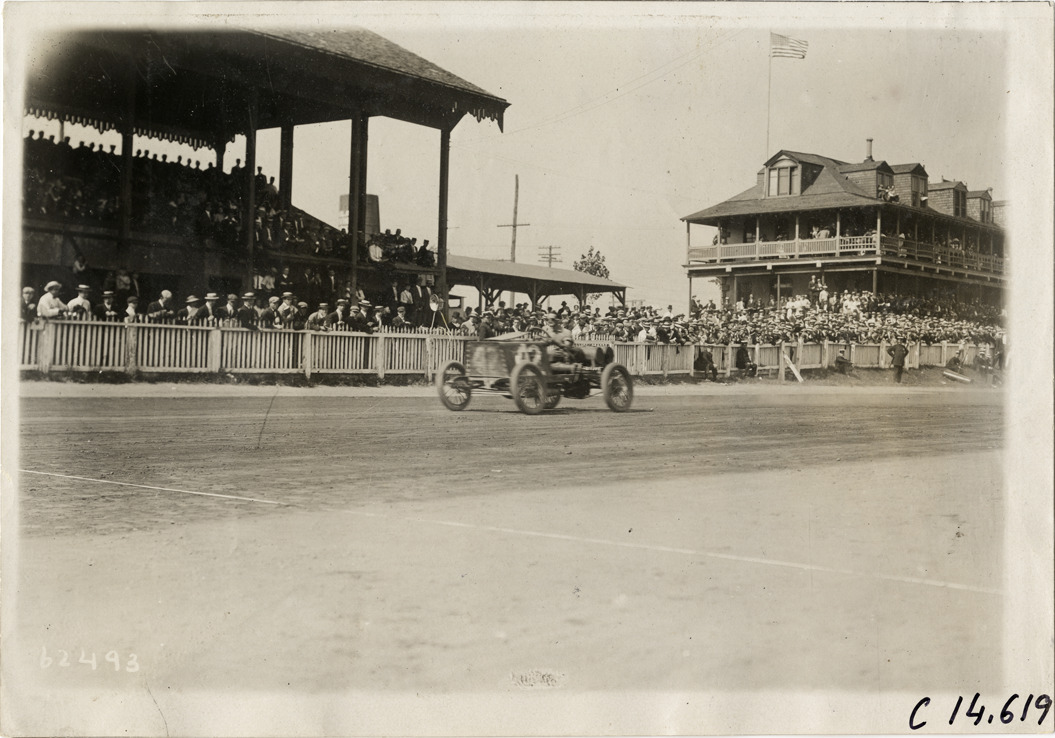 View of Ben Kirschner racing Darracq car no. 42 past grandstand and clubhouse during the 1910 races at the Point Breeze racetrack in Philadelphia, Pennsylvania. Stamped on back: "Spooner & Wells, Inc., photographers, telephones 3472-3473 Columbus, 1931 Broadway, New York." Handwritten on back: "Kirschner, Darracq after five mile record. Races and racing--Point Breeze races, 1910."