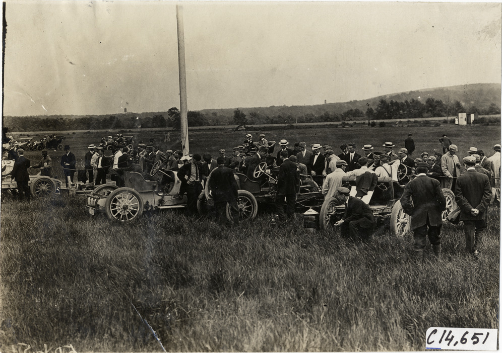 View of spectators and cars on roadside during the 1909 races at the Readville racetrack in Boston, Massachusetts. Stamped on back: "Spooner & Wells, Inc., photographers, telephones 3472-3473 Columbus, 1931 Broadway, New York." Handwritten on back: "Races and racing--Readville races, 1909."
