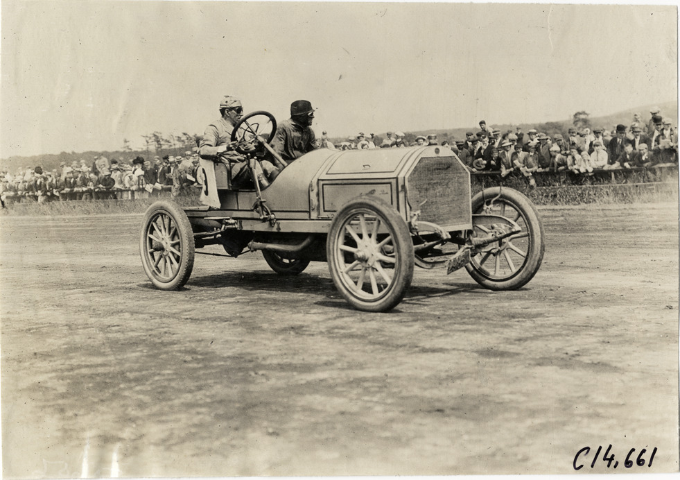 View of driver and passenger in car during the 1909 races at the Readville racetrack in Boston, Massachusetts. Spectators in background. Stamped on back: "Spooner & Wells, Inc., photographers, telephones 3472-3473 Columbus, 1931 Broadway, New York." Handwritten on back: "Races and racing--Readville races, 1909."