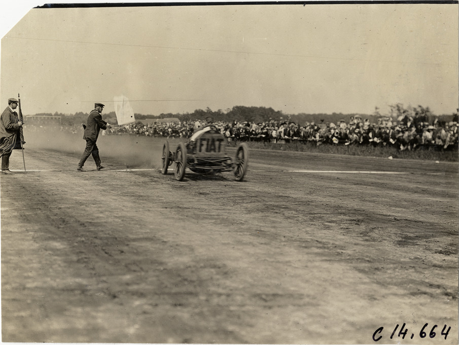 View of Ralph DePalma racing Fiat car across finish line during the 1909 races at the Readville racetrack in Boston, Massachusetts. Official waves flag. Stamped on back: "Spooner & Wells, Inc., photographers, telephones 3472-3473 Columbus, 1931 Broadway, New York." Handwritten on back: "De Palma. Races and racing--Readville races, 1909."