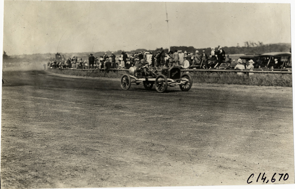 View of driver racing Buick car past spectators during the 1909 races at the Readville racetrack in Boston, Massachusetts. Stamped on back: "Spooner & Wells, Inc., photographers, telephones 3472-3473 Columbus, 1931 Broadway, New York." Handwritten on back: "Races and racing--Readville races, 1909."