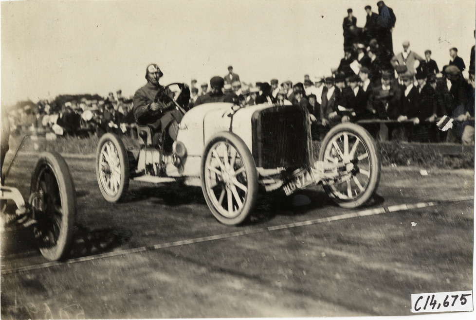 View of driver posing in racecar at starting line during the 1909 races at the Readville racetrack in Boston, Massachusetts. Stamped on back: "Spooner & Wells, Inc., photographers, telephones 3472-3473 Columbus, 1931 Broadway, New York." Handwritten on back: "Races and racing--Readville races, 1909."
