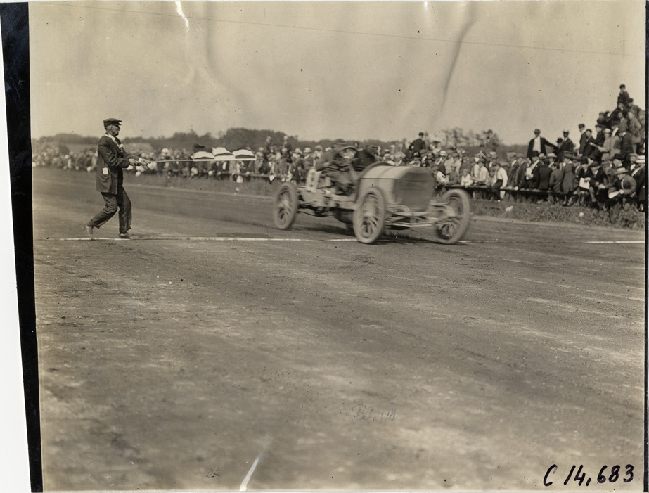 View of driver and passenger in car crossing finish line during the 1909 races at the Readville racetrack in Boston, Massachusetts. Official waves flag. Stamped on back: "Spooner & Wells, Inc., photographers, telephones 3472-3473 Columbus, 1931 Broadway, New York." Handwritten on back: "Races and racing--Readville races, 1909."