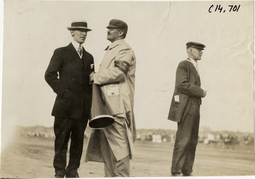 View of two officials standing with announcer holding megaphone during the 1909 races at the Readville racetrack in Boston, Massachusetts. Stamped on back: "Spooner & Wells, Inc., photographers, telephones 3472-3473 Columbus, 1931 Broadway, New York." Handwritten on back: "Races and racing--Readville races, 1909."