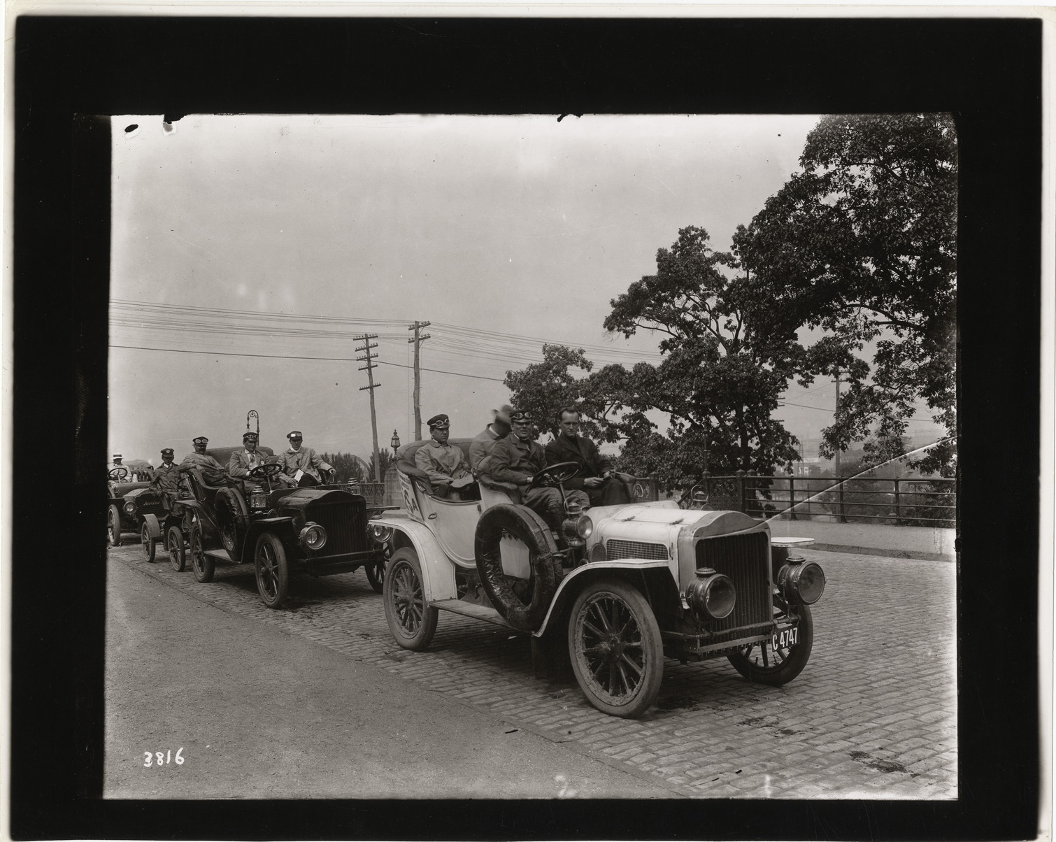 View of motorists in cars lined up in street for Sealed Bonnet Contest, sponsored by the A.C.A. Stamped on back: "Photographic illustration by Nick Lazarnick, 230 Park Ave., N.Y." Handwritten on back: "Races and racing--Sealed Bonnet Contest."