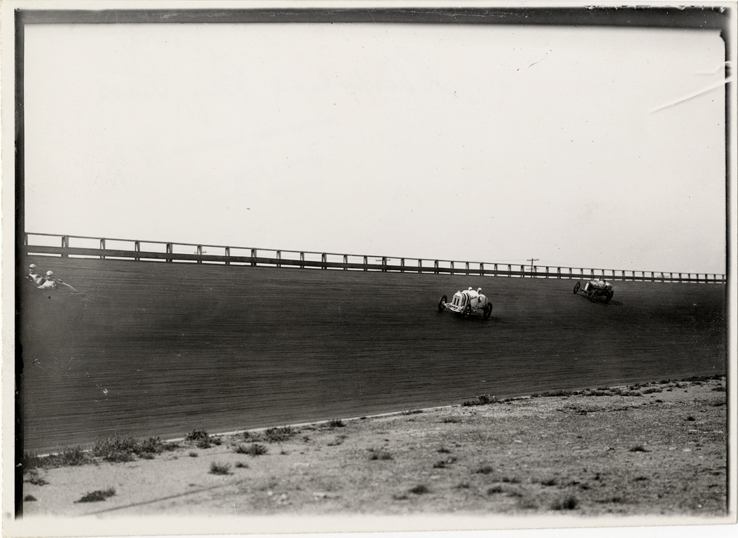 View of Maxwell car no. 11 and Sunbeam car no. 1 racing on track at Sheepshead Bay Speedway in Brooklyn, New York. Stamped on back: "Photographic illustration by Nick Lazarnick, 230 Park Ave., N.Y." Handwritten on back: "Sheepshead Bay board track, N.Y. 11 Maxwell, 1 Sunbeam. Races and racing--Sheepshead Bay races."