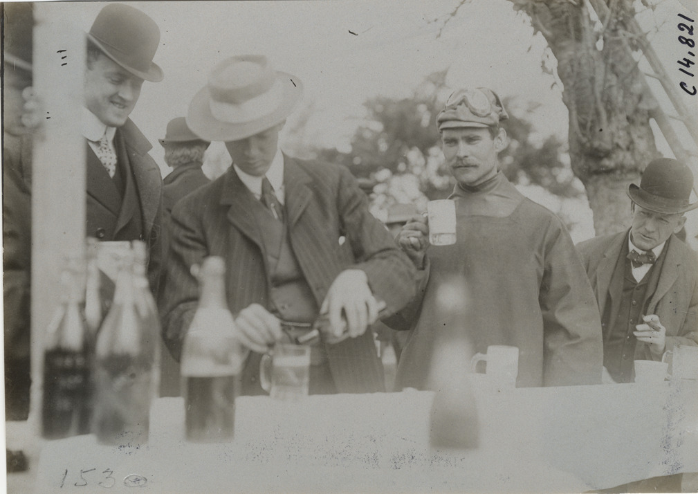 View of driver Joseph Tracy holding a cup during the 1904 Vanderbilt Cup races on Long Island, New York. Tracy stands next to a man fixing a beverage at table; bottles in foreground. Handwritten on back: "Joseph Tracy, 2nd from right. Races and racing--Vanderbilt Cup races, 1904."