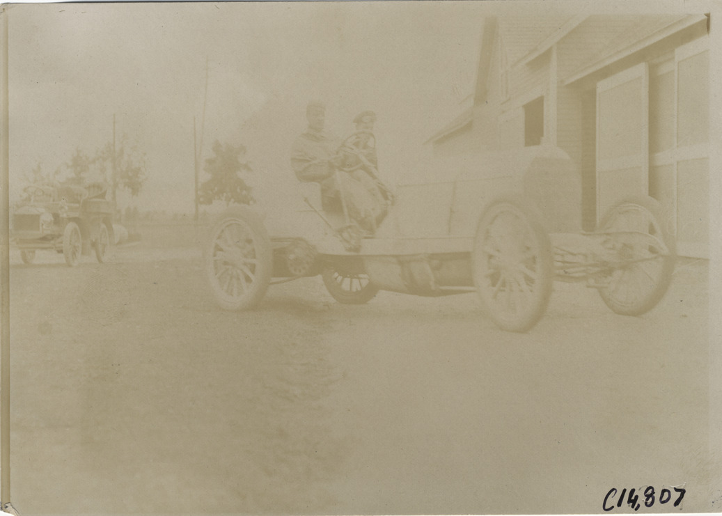 View of William Wallace and passenger posing in Fiat car during the 1904 Vanderbilt Cup races on Long Island, New York. Handwritten on back: "#19 90 h.p. Fiat, driven by William Wallace. Races and racing--Vanderbilt Cup races, 1904."
