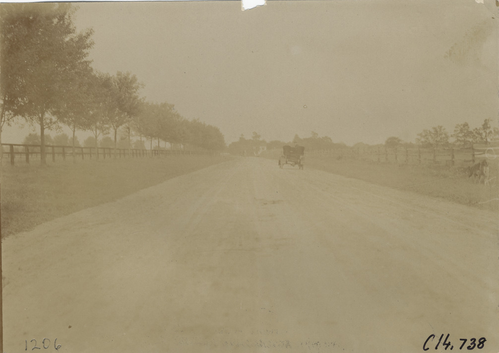 Rear view of motorists in car traveling on rural dirt road, part of the course for the 1904 Vanderbilt Cup races on Long Island, New York. Handwritten on back: "Part of the course. Races and racing--Vanderbilt Cup races, 1904."