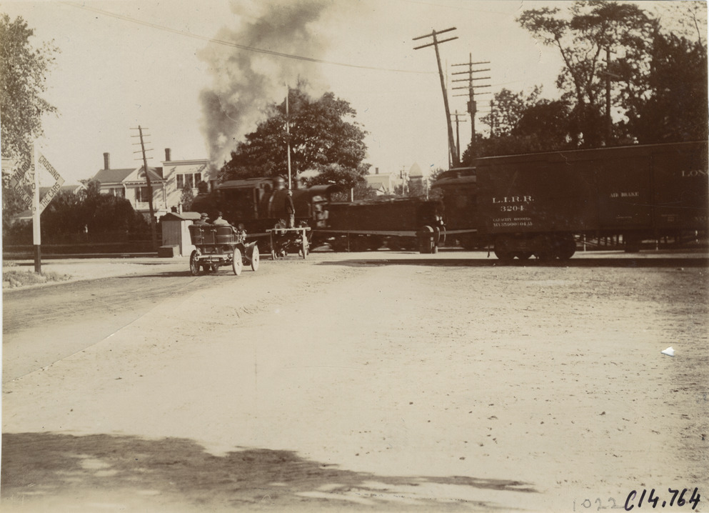 View of motorists in car waiting for train to pass at railroad crossing, part of the course for the 1904 Vanderbilt Cup races on Long Island, New York. Handwritten on back: "Part of the course. Races and racing--Vanderbilt Cup races, 1904."