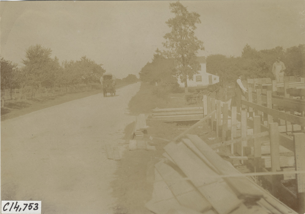 Front view of horse-drawn wagon traveling on rural dirt road, part of the course for the 1904 Vanderbilt Cup races on Long Island, New York. Men constructing bleachers on right; house in background. Handwritten on back: "Part of the course. Races and racing--Vanderbilt Cup races, 1904."