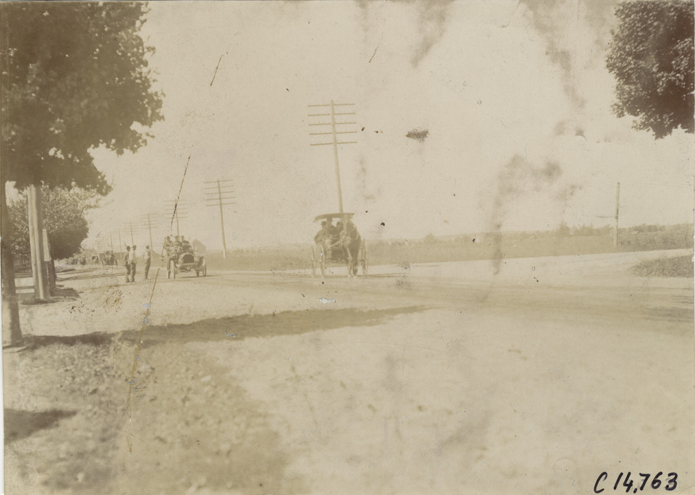 View of motorists in car traveling on rural dirt road, part of the course for the 1904 Vanderbilt Cup races on Long Island, New York. Horse-drawn carriage on right. Handwritten on back: "Part of the course. Races and racing--Vanderbilt Cup races, 1904."