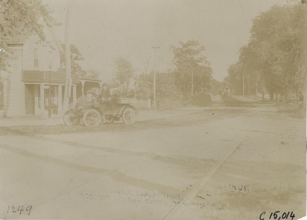 View of motorist traveling in car on dirt road, part of the course for the 1904 Vanderbilt Cup races on Long Island, New York. House or commercial building on left. Handwritten on back: "Part of the course. Races and racing--Vanderbilt Cup races, 1904."