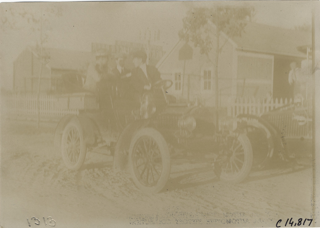 View of motorists in Maxwell car during the 1904 Vanderbilt Cup races on Long Island, New York. Handwritten on back: "Maxwell passenger car. Races and racing--Vanderbilt Cup races, 1904."
