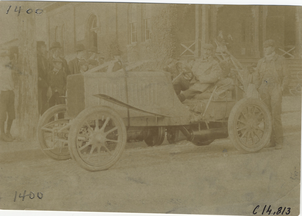 View of George Teste in Panhard car during the 1904 Vanderbilt Cup races on Long Island, New York. Onlookers in background. Handwritten on back: "#15 90 h.p. Panhard, driven by George Teste. Races and racing--Vanderbilt Cup races, 1904."