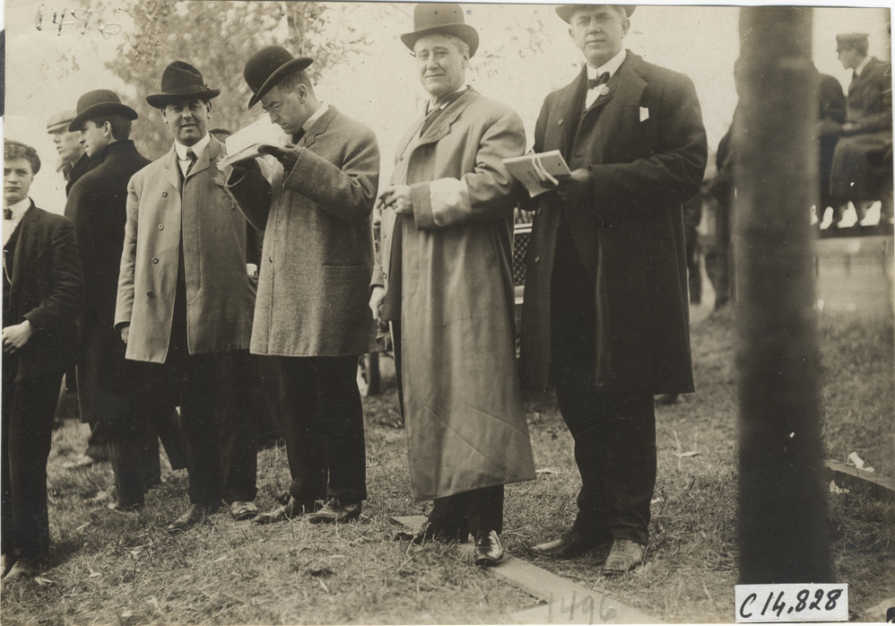 View of John Farson, Robert Spangler and two unidentified men during the 1904 Vanderbilt Cup races on Long Island, New York. Handwritten on back: "[undecipherable], John Farson, Sec'y Spangler. Races and racing--Vanderbilt Cup races, 1904."