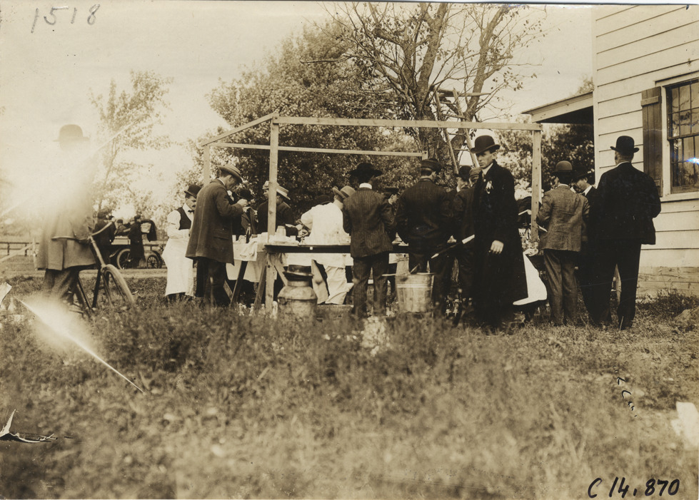 Men surrounding picnic table, 1904 Vanderbilt Cup races