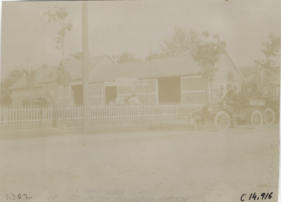 View of wooden-frame garage during the 1904 Vanderbilt Cup races on Long Island, New York. Car is parked in foreground; sign displayed in front of garage reads: "Garage, automobile supplies." Handwritten on back: "Races and racing--Vanderbilt Cup races, 1904."