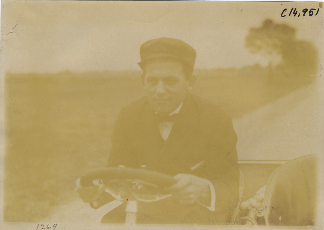 Close-up view of driver A.C. Webb in Pope-Toledo car, during the 1904 Vanderbilt Cup races on Long Island, New York. Handwritten on back: "#4 60 h.p. Pope-Toledo, driven by A.C. Webb. Races and racing--Vanderbilt Cup races, 1904."