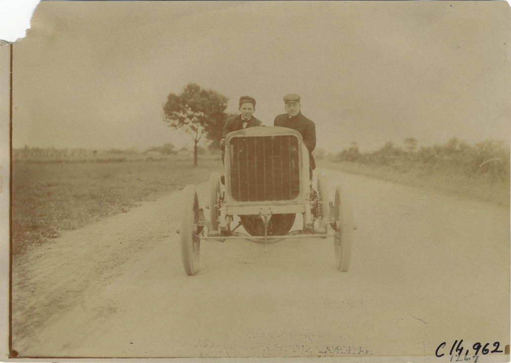 Front view of driver A.C. Webb and passenger in Pope-Toledo car, during the 1904 Vanderbilt Cup races on Long Island, New York. Handwritten on back: "#4 60 h.p. Pope-Toledo, driven by A.C. Webb. Races and racing--Vanderbilt Cup races, 1904."