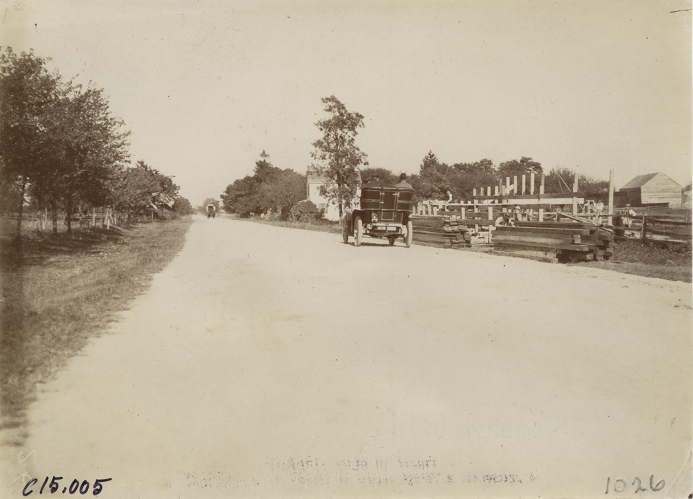 Rear view of motorists in car traveling on dirt road, part of the course for the 1904 Vanderbilt Cup races on Long Island, New York. Men constructing bleachers on right. Handwritten on back: "Part of the course. Races and racing--Vanderbilt Cup races, 1904."