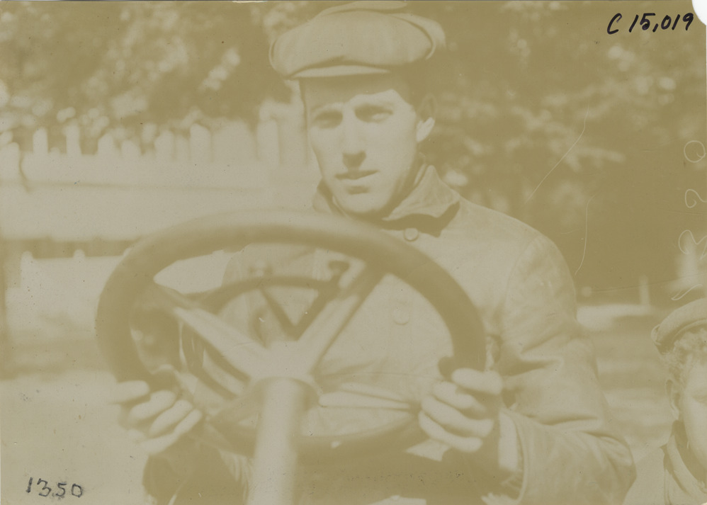 Close-up view of unidentified driver in car during the 1904 Vanderbilt Cup races on Long Island, New York. Handwritten on back: "Races and racing--Vanderbilt Cup races, 1904."