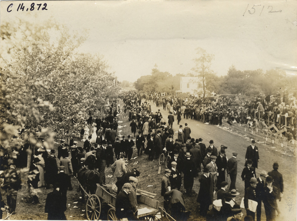 View of spectators along course during the 1904 Vanderbilt Cup races on Long Island, New York. Handwritten on back: "Races and racing--Vanderbilt Cup races, 1904."