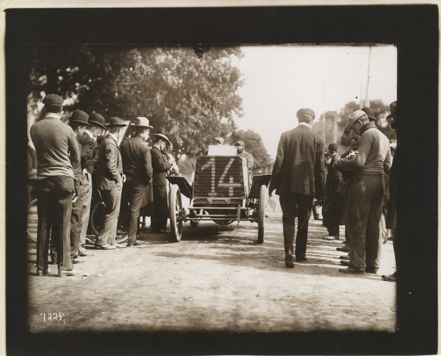 Front view of George Heath and passenger in Panhard car no. 14, surrounded by spectators, during the 1904 Vanderbilt Cup races on Long Island, New York. Stamped on back: "Photographic illustration by Nick Lazarnick, 230 Park Ave., N.Y." Handwritten on back: "George Heath, American born resident of Paris, winner of first Vanderbilt Cup race in Panhard, 1904. Races and racing--Vanderbilt Cup races, 1904."
