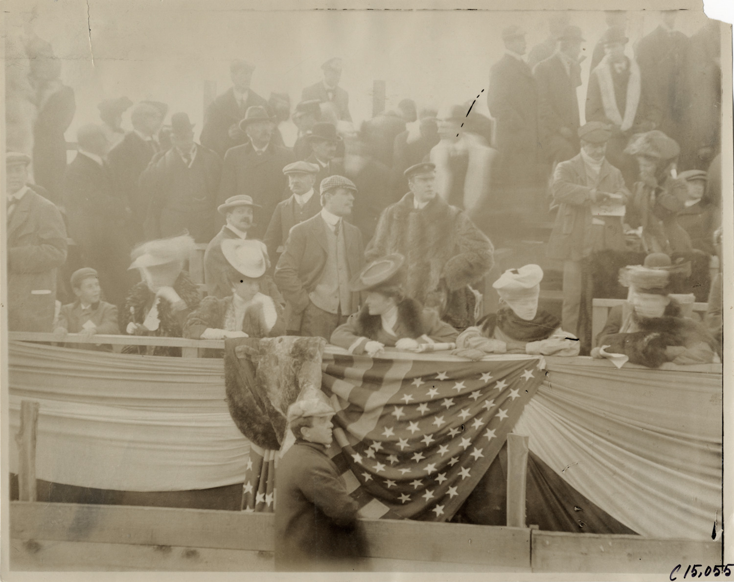 Close-up view of spectators in grandstand during the 1905 Vanderbilt Cup races on Long Island, New York. Stamped on back: "Photo by F. Ed. Spooner, 1536 B'way, telephone 6536-38th St., New York, N.Y." Handwritten on back: "Races and racing--Vanderbilt Cup races, 1905."