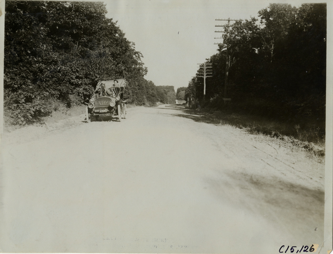 View of motorists in car traveling on rural dirt road, part of the course for the 1905 Vanderbilt Cup races on Long Island, New York. Handwritten on back: "Part of the course. Races and racing--Vanderbilt Cup races, 1905."