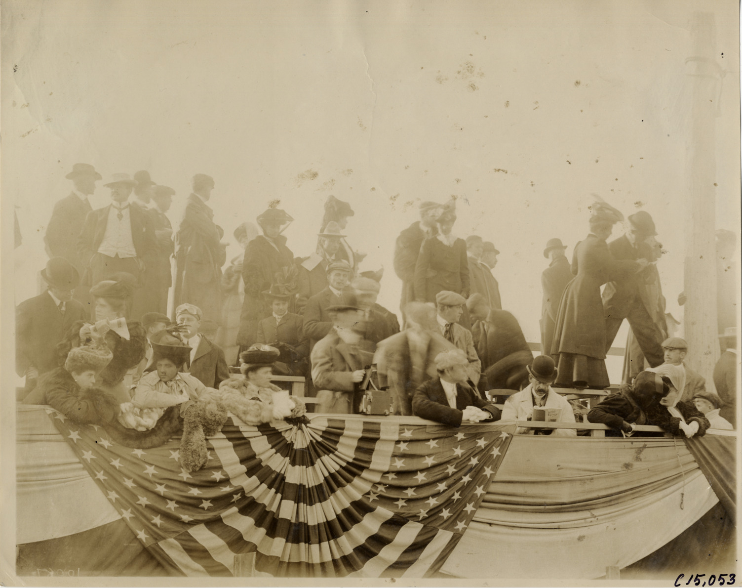 Close-up view of spectators in grandstand during the 1905 Vanderbilt Cup races on Long Island, New York. Bleachers are decorated with bunting. Stamped on back: "Photo by F. Ed. Spooner, 1536 B'way, telephone 6536-38th St., New York, N.Y." Handwritten on back: "Races and racing--Vanderbilt Cup races, 1905."