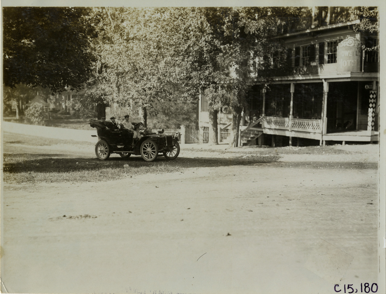 View of motorists in car parked in front of Powell's Hotel during the 1905 Vanderbilt Cup races on Long Island, New York. Stamped on back: "Photo by F. Ed. Spooner, 1536 B'way, telephone 6536-38th St., New York, N.Y." Handwritten on back: "Races and racing--Vanderbilt Cup races, 1905."